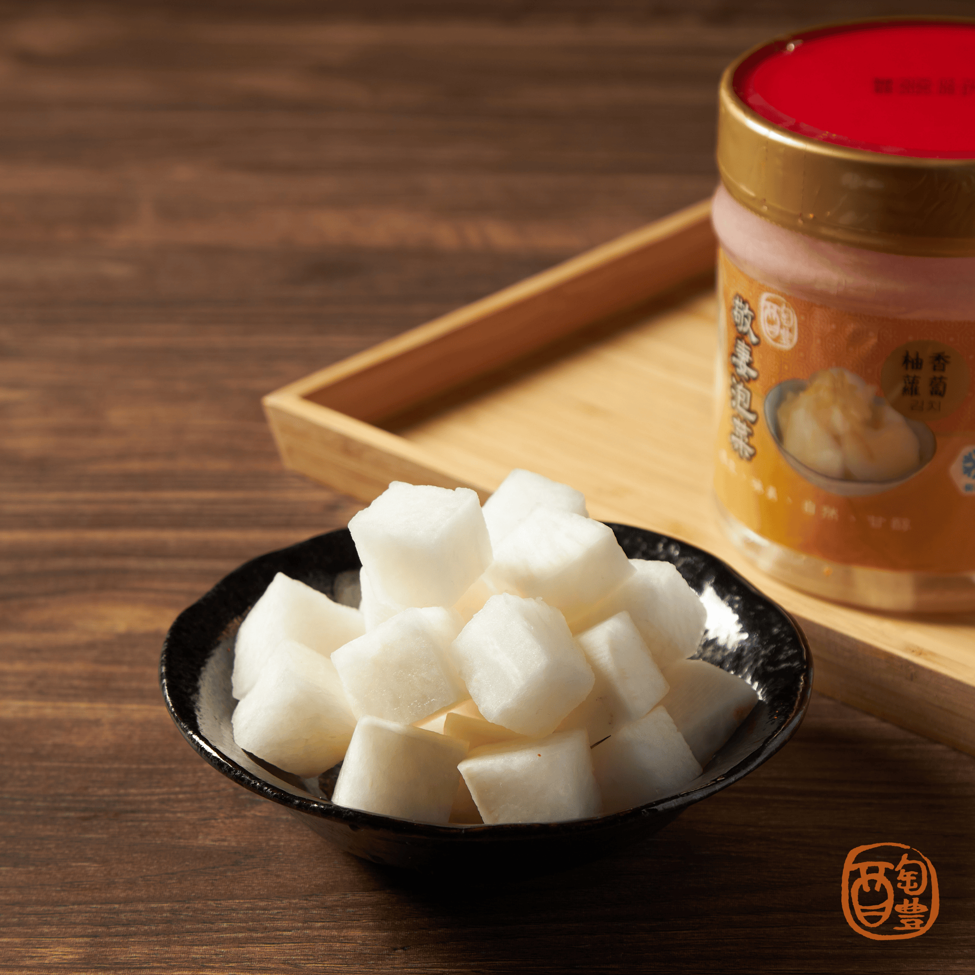 特選新鮮日本大根與韓國知名柚子茶的柚香蘿蔔,堅持以傳統工法自然、發酵而成,讓天然食材所散發出的淡淡香氣增添出食物香甜、清脆的口感,本產品提供給素食主義的朋友另一種截然不同的風味品嘗。